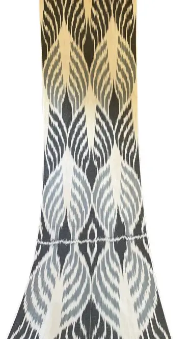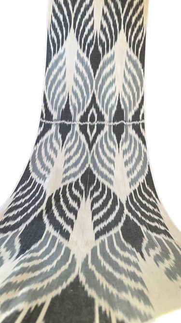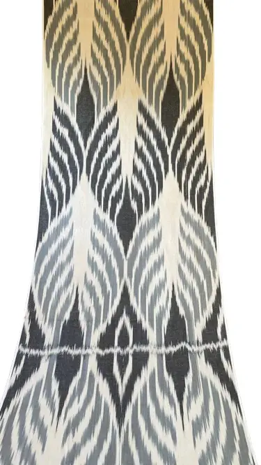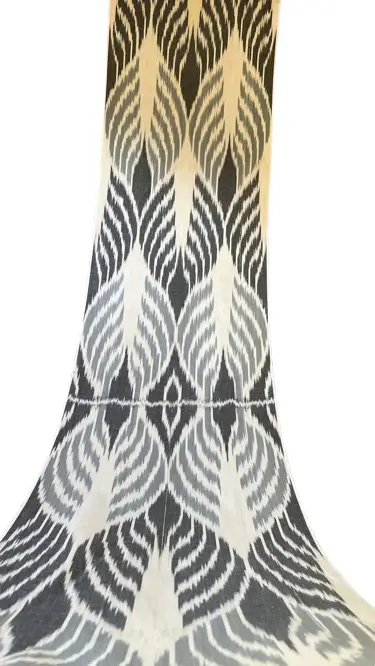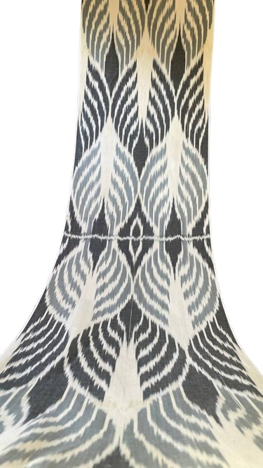 Ein Design von solch komplizierter Schönheit erfordert ein Material, das seine zarte Natur ehren kann. Dieser Gefiederte Linien Ikat wird typischerweise aus einer erstklassigen Adras-Mischung aus Seide und Baumwolle gefertigt. Die Seide ist entscheidend, um die weiche Leuchtkraft der Grautöne und die Klarheit des Weißes einzufangen. Die Baumwolle liefert den notwendigen Körper und die Struktur und stellt sicher, dass das Textil langlebig ist.