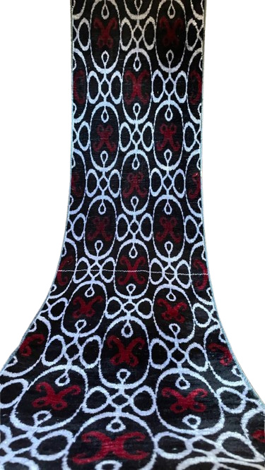 Das Muster dieses Stoffes ist eine Feier disziplinierter Schönheit und komplizierter Wiederholung, perfekt abgestimmt auf die tiefe Textur von Samt. Die dominanten Motive sind elegante, längliche Ovalformen, die sich ineinander verketten. Innerhalb der weißen Formen erscheinen kühne, karmesinrote Elemente. Das Zusammenspiel des tiefen Schwarzes, klaren Weißes und lebhaften Rots, hervorgehoben durch den Samtflor, verleiht dem Stoff eine fast dreidimensionale Qualität.