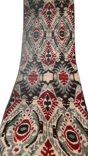 Das Muster dieses Stoffes ist eine Feier ornamentaler Schönheit und kraftvoller Symmetrie, perfekt abgestimmt auf die tiefe Textur von Samt, durchdrungen von einer unverwechselbar tribalistischen Ästhetik. Die Formen sind elegant und geschwungen. Das Zusammenspiel der kühnen Farben und das Spiel von Licht und Schatten auf dem Samt verleihen dem Stoff eine fast dreidimensionale Qualität.