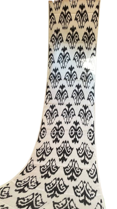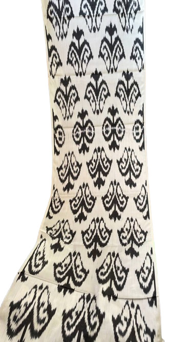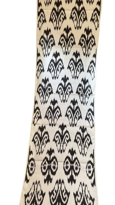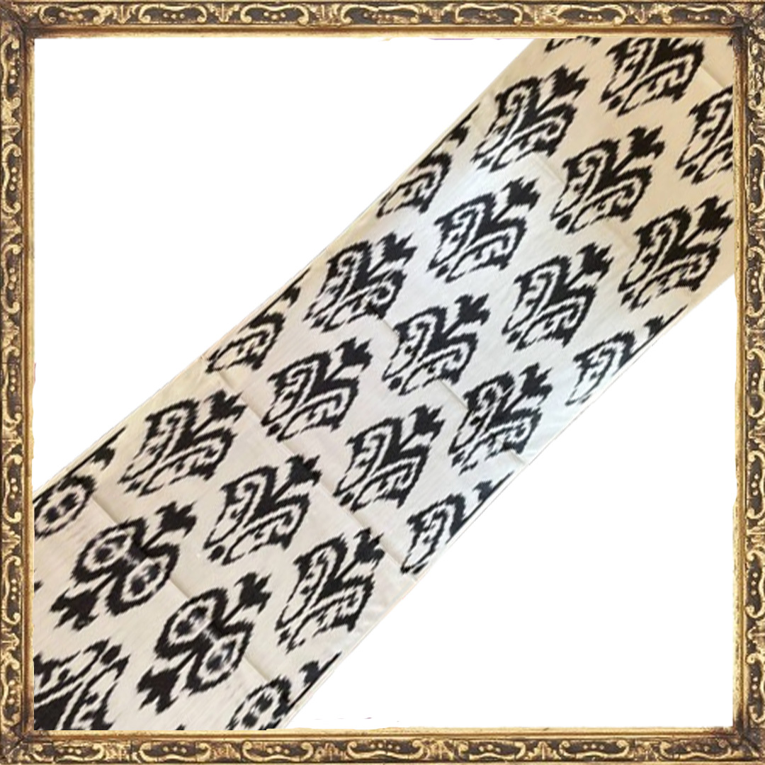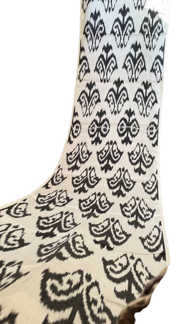 Erleben Sie gewebte Noblesse: Der authentische Schwarzer Weißer Schildmuster Ikat Stoff