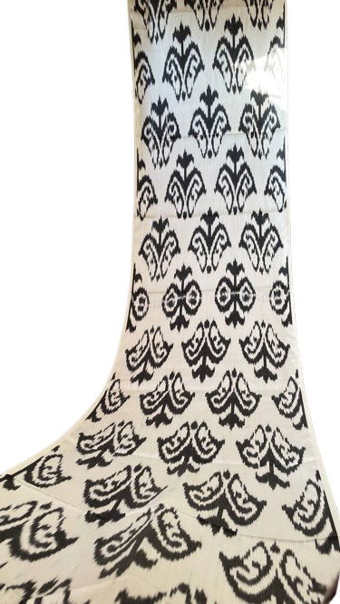 Im großen Teppich der Textilgeschichte tragen einige Muster einen Hauch von Adel und zeitloser Würde. Dieses außergewöhnliche Gewebe aus Usbekistan ist ein Meisterwerk solchen Designs: ein wahrhaft stattlicher Schwarzer Weißer Schildmuster Ikat Stoff, der die Eleganz alter Heraldik und die Raffinesse klassischer Kunst hervorruft.