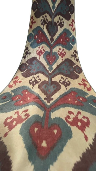 El corazón de este diseño es su poderosa estructura. Cuando mira este Textil ikat de motivos simétricos, está viendo símbolos que han sido parte del arte de Asia Central durante siglos, como el Árbol de la Vida y los motivos de corazones. Lograr tal simetría con la técnica del ikat es la marca de un verdadero maestro artesano.