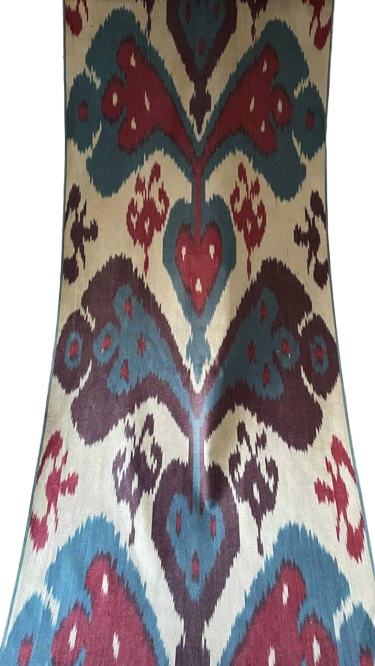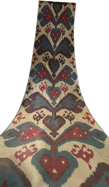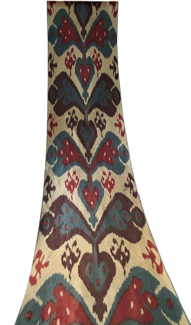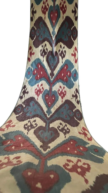 La sensación de lujo de este tejido proviene de la mezcla tradicional Adras de seda y algodón. La seda proporciona el brillo luminoso, mientras que el algodón aporta estructura y durabilidad. Esta mezcla asegura que este Textil ikat de motivos simétricos sea visualmente impresionante y un material robusto.