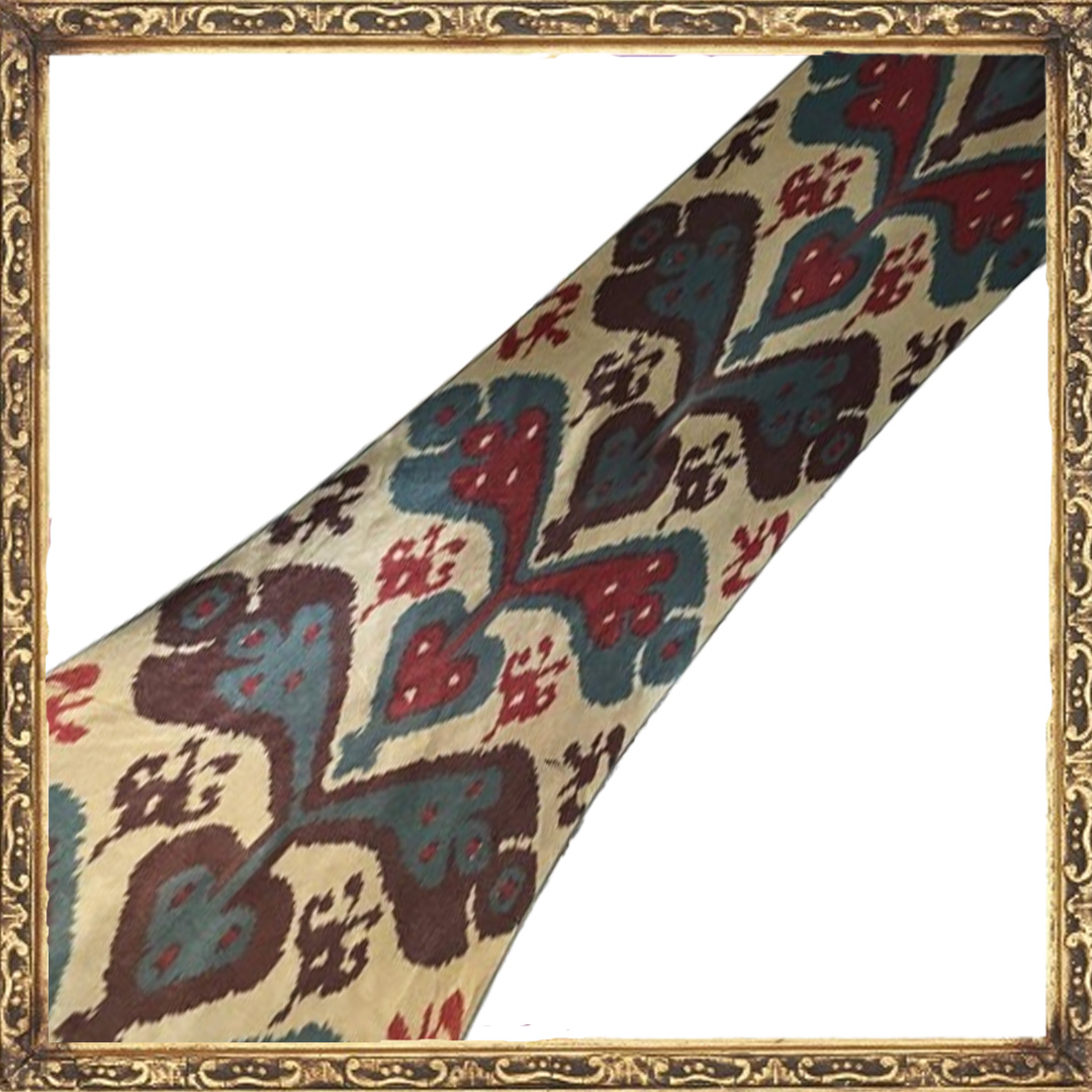 Hay una belleza profunda en el equilibrio perfecto. Este exquisito tejido de Uzbekistán es una clase magistral de armonía, un verdadero Textil ikat de motivos simétricos que habla de una apreciación por la estructura y la precisión artística. Su diseño es una composición deliberada y arquitectónica que crea una sensación de majestuosidad y elegancia atemporal.
