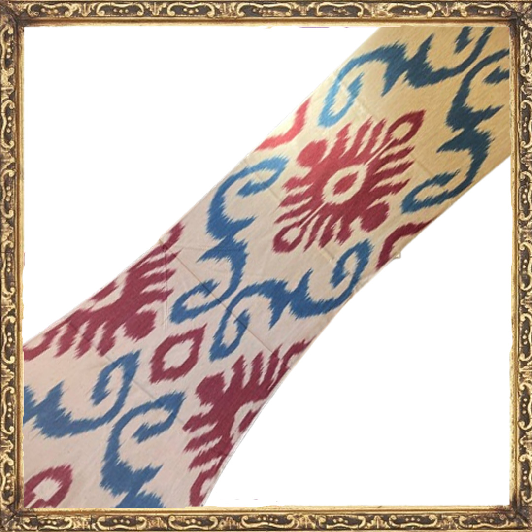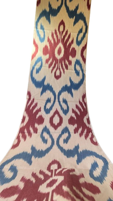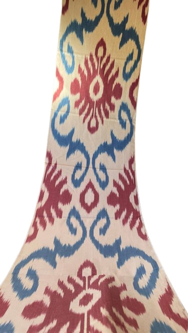 Un diseño de tal energía requiere un material que pueda mostrar su brillantez. Este Ikat coral cielo se elabora típicamente a partir de una mezcla Adras de primera calidad de seda y algodón. La seda es esencial para lograr la saturación luminosa del rojo coral y el azul cielo. El algodón proporciona el cuerpo y la estructura necesarios, asegurando que el textil sea duradero.