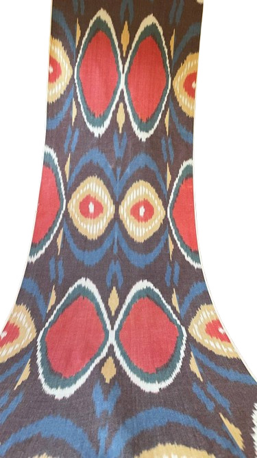 El atractivo visual que este Ikat óvalo retro posee es inmediato y profundamente atractivo. El diseño es una cascada rítmica de formas ovaladas alargadas. La paleta de colores es un estudio de contrastes vibrantes pero terrosos: un marrón oscuro casi negro forma el fondo dramático. Sobre este, formas luminosas en rojo terracota, azul sereno y amarillo dorado se despliegan.