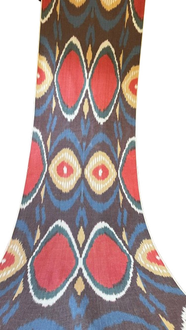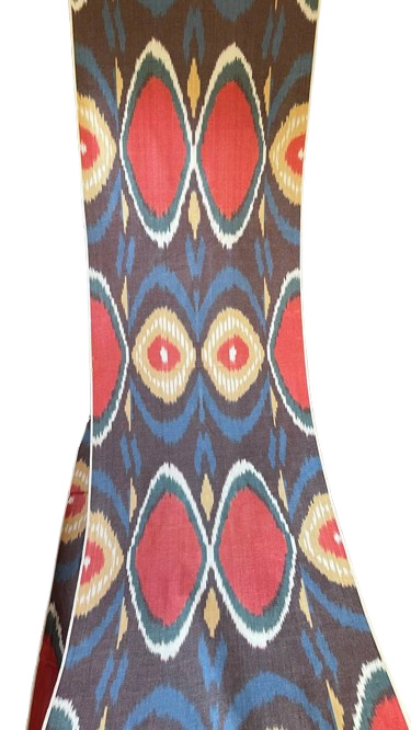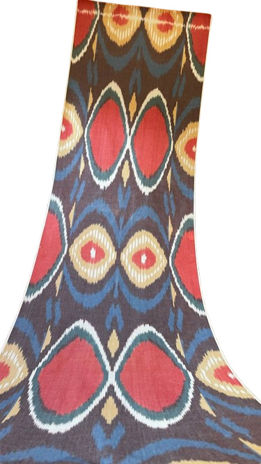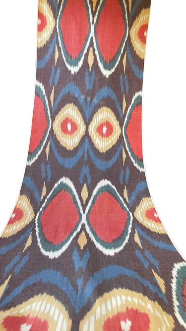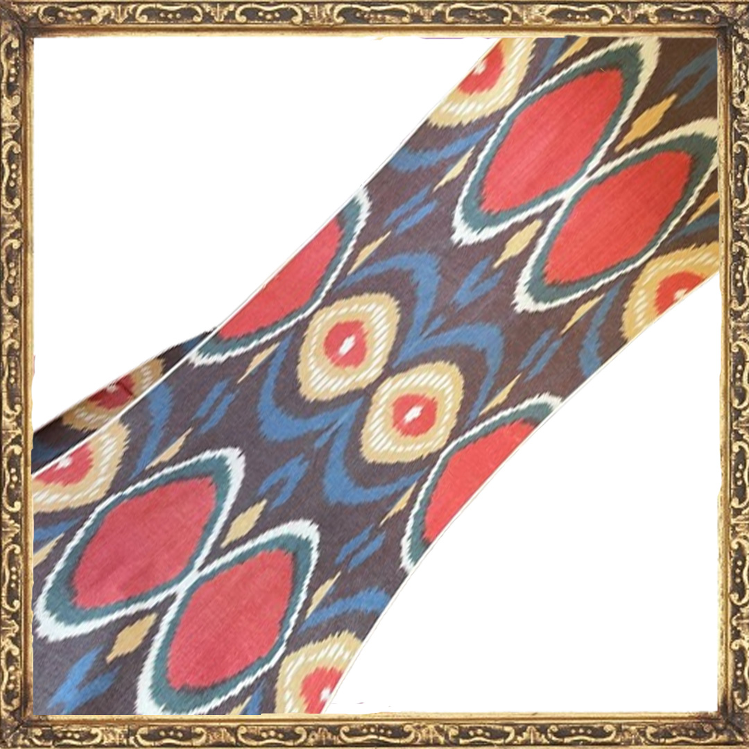 En el caleidoscopio de los diseños textiles, algunos patrones poseen un encanto inconfundible, transportándote a una época de colores audaces y estilo seguro. Este extraordinario tejido de Uzbekistán es una obra maestra de tal arte evocador: un verdaderamente cautivador Ikat óvalo retro que pulsa con el espíritu del diseño clásico.