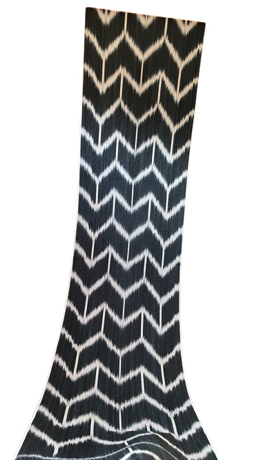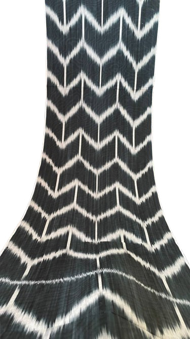 El poder visual que este Tejido Ikat Clásico Blanco Negro posee reside en su composición pura y elemental. El diseño es una cascada limpia y rítmica de chevrones, organizados en fuertes columnas verticales. La paleta de colores es la combinación más clásica y poderosa imaginable: un negro profundo y saturado traza el audaz patrón sobre un fondo blanco cremoso y limpio.