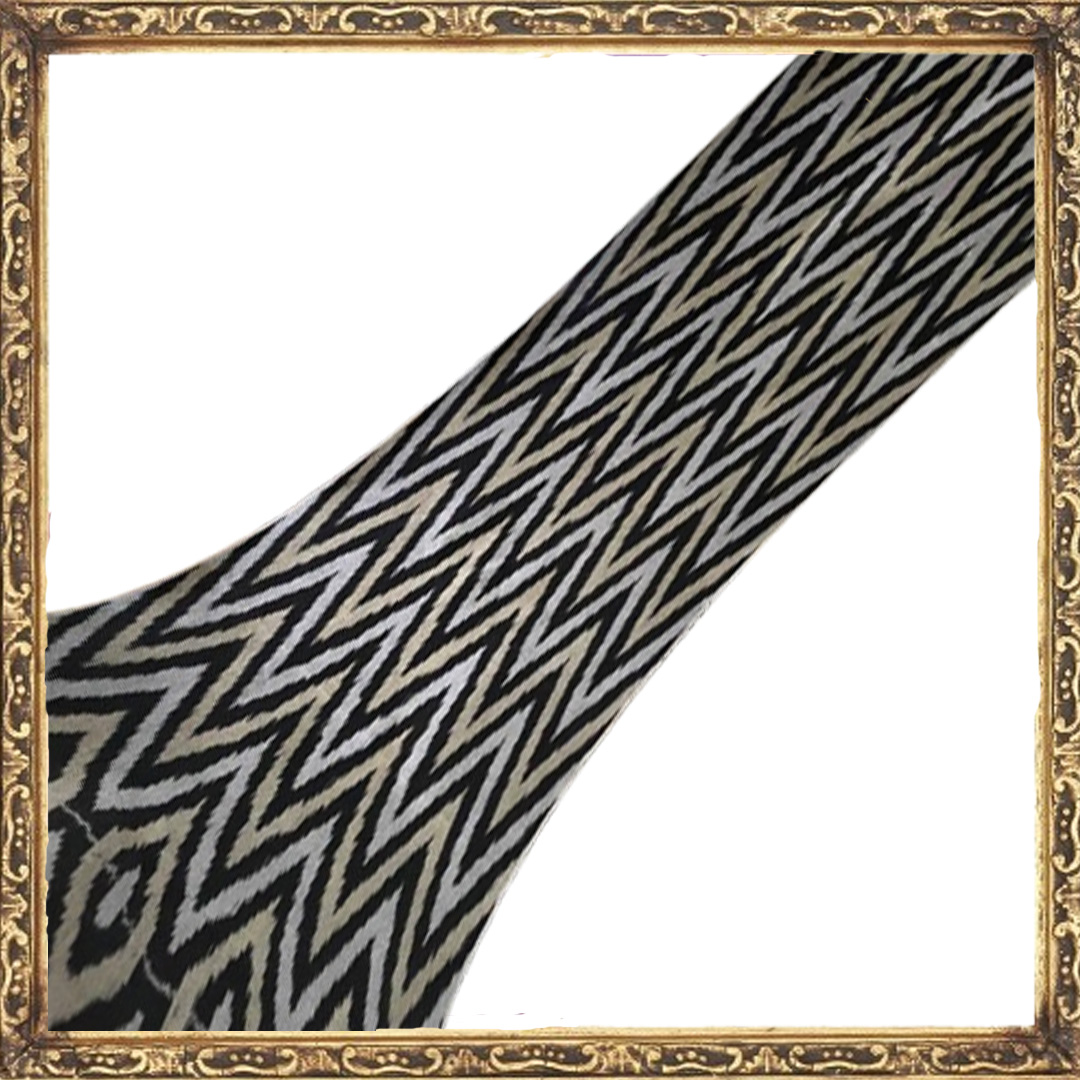 Adéntrese en un mundo donde la artesanía ancestral se encuentra con la vanguardia contemporánea. Este extraordinario textil de Uzbekistán es una clase magistral de ritmo gráfico, un verdaderamente hipnótico Tejido Ikat Zigzag Negro Gris que vibra con energía y un estilo sofisticado.