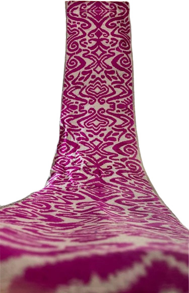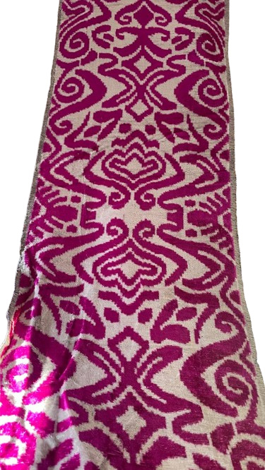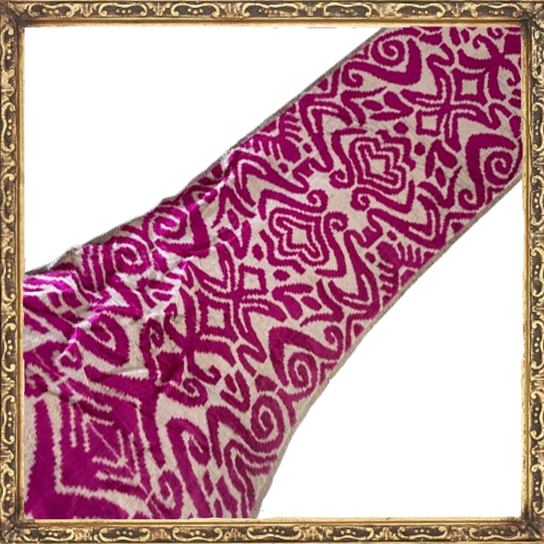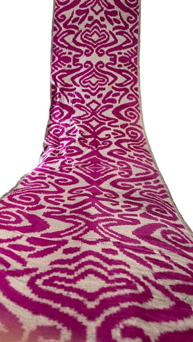 En el gran panteón de los textiles de lujo, algunas creaciones susurran elegancia, mientras que otras declaran su presencia con una confianza electrizante. Este material extraordinario de Uzbekistán es una obra maestra de opulencia inigualable: un verdaderamente magnífico Terciopelo Ikat Magenta y Beige que une la riqueza táctil del terciopelo con la belleza hipnótica del ikat teñido a mano.
