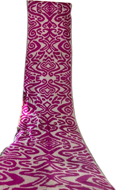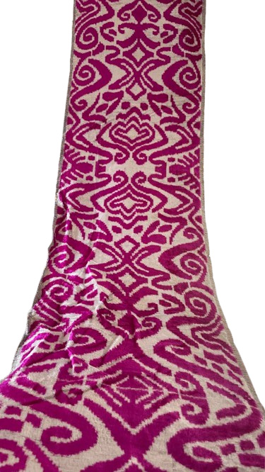 Al elegir este textil auténtico, está invirtiendo en una pieza de magnificencia tejida, adquiriendo una Terciopelo Ikat Magenta y Beige que traerá un esplendor real y un alma artística a su mundo.