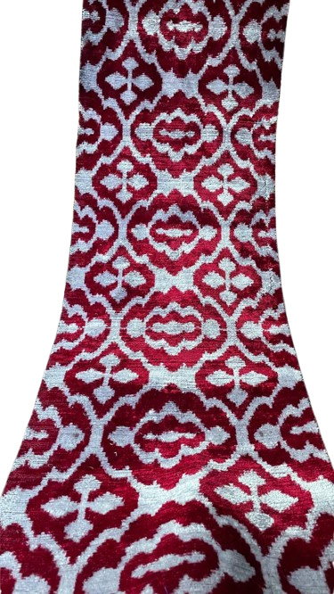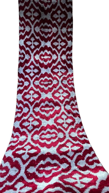 Al elegir este textil auténtico, está invirtiendo en una pieza de magnificencia tejida, adquiriendo una Terciopelo Ikat Rojo Ornamental que traerá un esplendor real y un alma artística a su mundo.