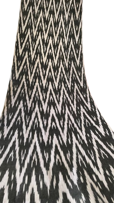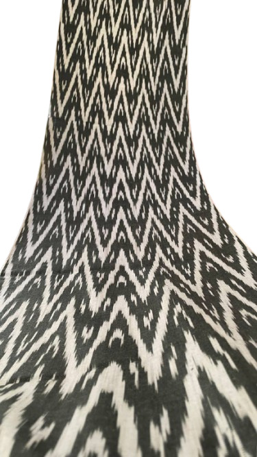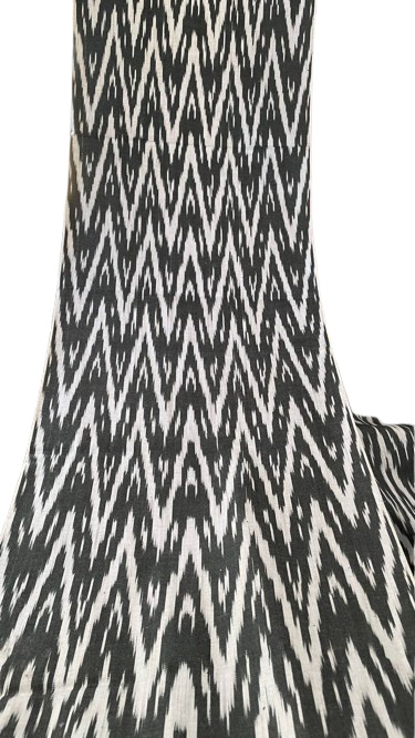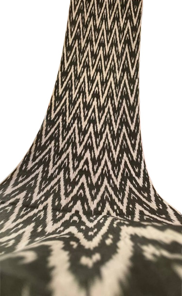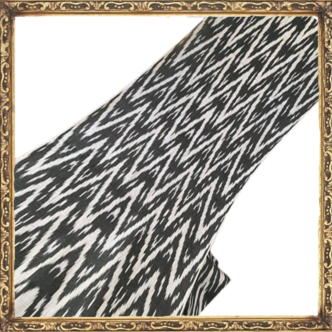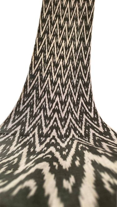 Dans le monde des textiles, certains motifs sont conçus pour impressionner, mais seuls quelques-uns possèdent le pouvoir de véritablement hypnotiser. Ce tissu extraordinaire d’Ouzbékistan est un chef-d’œuvre de mouvement visuel, un Ikat chevron monochrome vraiment captivant qui vibre d’une énergie hypnotique et d’une élégance graphique.