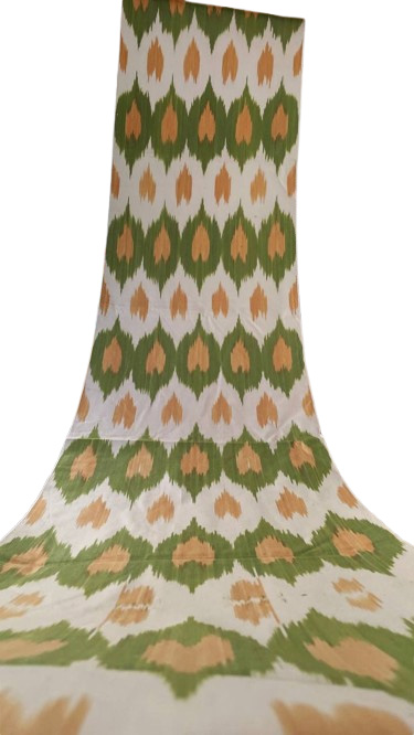Le génie de ce tissu réside dans sa capacité à abstraire des formes naturelles en un motif à la fois universellement reconnaissable et incroyablement artistique. Les motifs dominants sont d’élégantes formes allongées en forme de goutte ou de feuille qui créent un mouvement descendant gracieux. L’interaction entre le vert olive riche et les tons chauds abricot/bronzage confère à cet Ikat goutte olive son caractère unique. Ce qui élève vraiment ce tissu, c’est l’effet abr, le doux bord plumeux qui crée une transition subtile et éthérée.