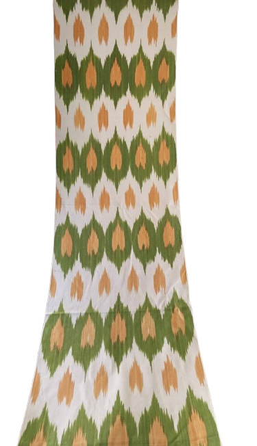 L’attrait visuel que cet Ikat goutte olive dégage est immédiat et profondément apaisant. Le design est un motif rythmique et en cascade de formes stylisées en forme de goutte ou de feuille. La palette de couleurs est une étude d’harmonie naturelle : un vert olive sourd et sophistiqué offre une présence ancrée. Il est magnifiquement complété par des tons chauds d’abricot ou de bronzage doré. Tout cela sur un fond blanc pur et lumineux.