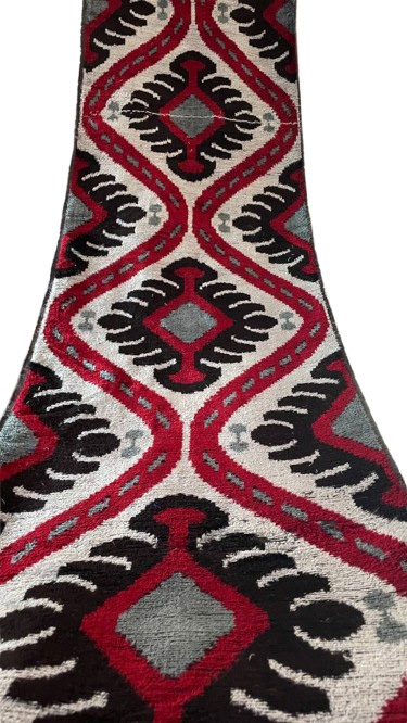 Le motif de ce tissu est une célébration de la beauté ornementale et de la symétrie puissante, parfaitement adapté à la texture profonde du velours. Les formes sont élégantes et sinueuses, comme des médaillons ou des symboles. L’interaction du rouge vif, du noir profond et du gris frais, rehaussée par la définition nette de l’ikat, confère au tissu une qualité presque tridimensionnelle.