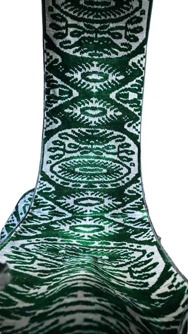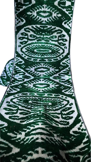Dans le grand panthéon des textiles de luxe, peu de créations attirent l’attention avec la même richesse époustouflante et l’artisanat vibrant que le véritable velours de soie, surtout lorsqu’il devient la toile vivante d’un ikat complexe teint à la main. Ce matériau extraordinaire d’Ouzbékistan est un chef-d’œuvre d’opulence inégalée : un Velours Ikat Vert et Blanc vraiment magnifique qui marie la profondeur tactile du velours à la beauté hypnotique d’une symphonie chromatique.