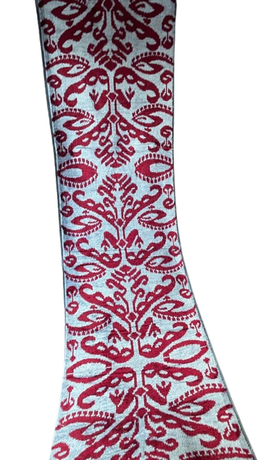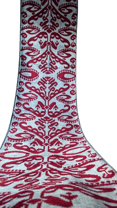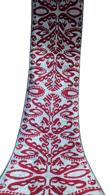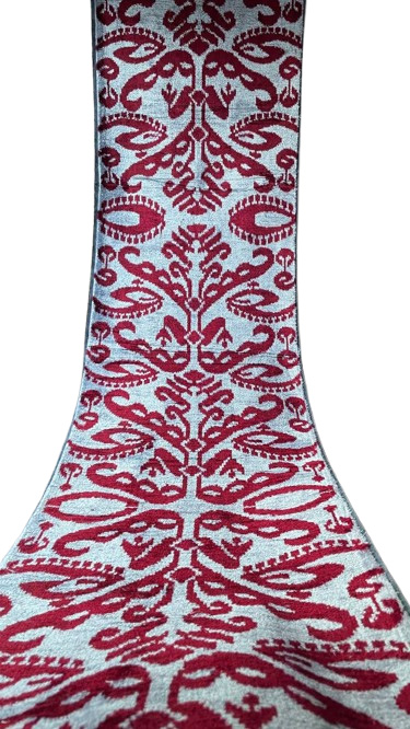 Dans la danse éthérée de l’art textile, certaines créations évoquent un jeu à couper le souffle de forces contrastées – comme la chaleur du feu contre la fraîcheur de la glace, ou de riches joyaux transparaissant à travers un voile de givre. Ce matériau extraordinaire d’Ouzbékistan est un chef-d’œuvre d’opulence inégalée : un Velours Ikat Rubis Givré vraiment magnifique qui marie la richesse tactile du velours à la beauté hypnotique de l’ikat teint à la main.