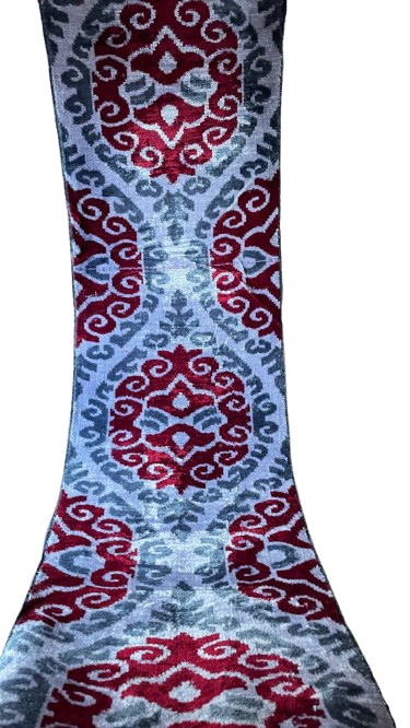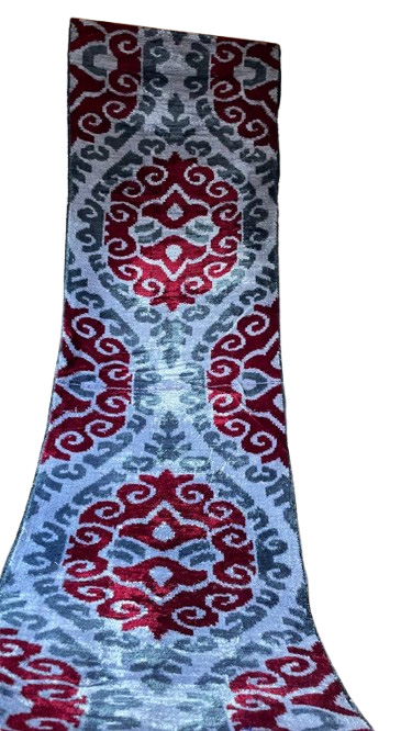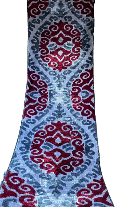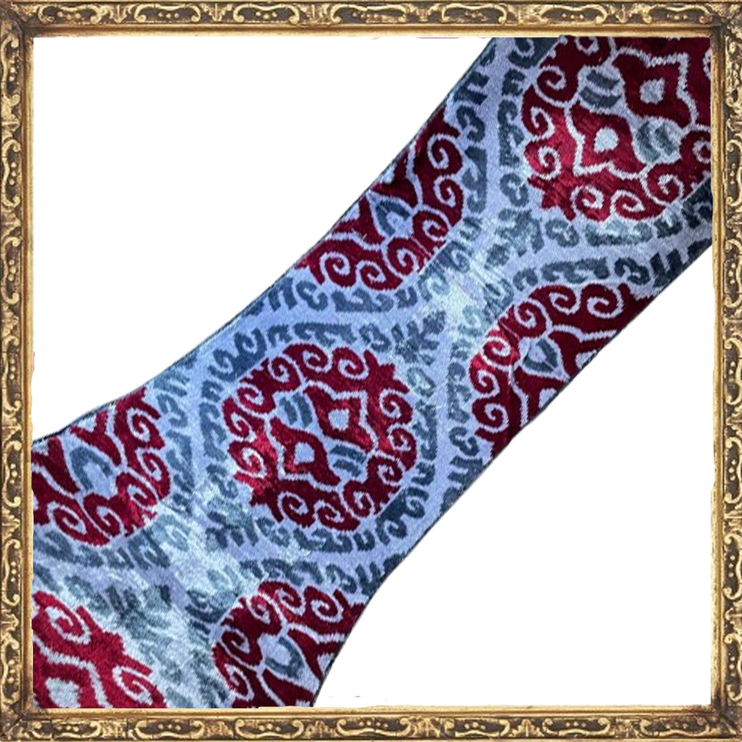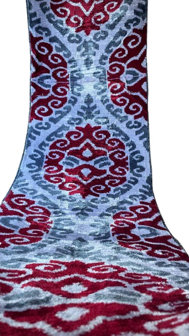 Découvrez l’opulence givrée: L’authentique Velours Ikat Rouge Gris et Bleu Clair