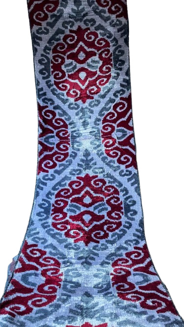 Dans la danse éthérée de l’art textile, certaines créations évoquent la beauté sereine des paysages hivernaux, où les couleurs riches transparaissent à travers un voile de givre et de lumière. Ce matériau extraordinaire d’Ouzbékistan est un chef-d’œuvre d’opulence inégalée : un Velours Ikat Rouge Gris et Bleu Clair vraiment magnifique qui marie la richesse tactile du velours à la beauté hypnotique de l’ikat teint à la main.