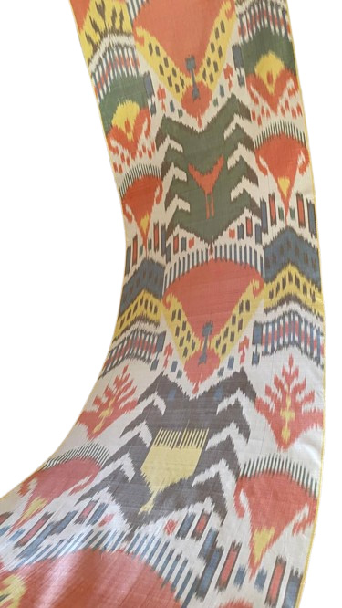Nel vasto arazzo dell’arte umana, alcuni tessuti parlano di una forza silenziosa e della bellezza duratura della terra stessa. Questo straordinario tessuto dall’Uzbekistan è un capolavoro di eleganza radicata: una Seta Ikat Toni Terra Caldi veramente affascinante che sembra un paesaggio baciato dal sole trasformato in seta.