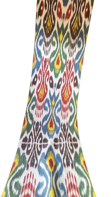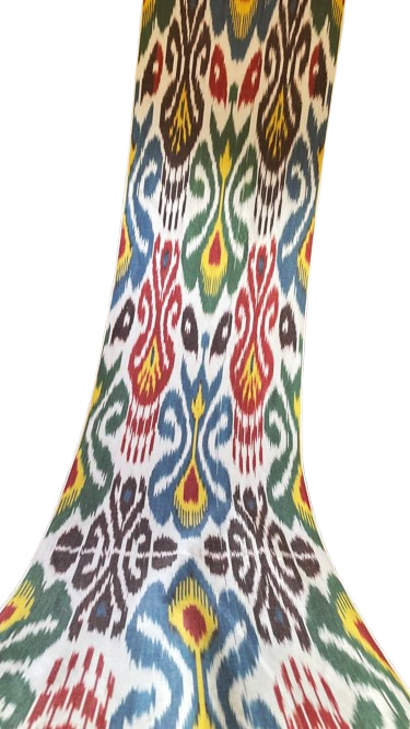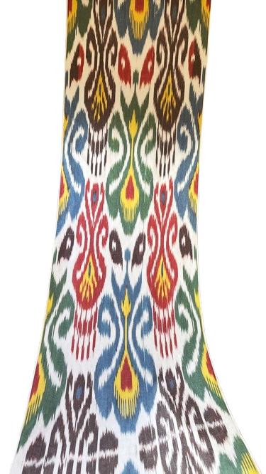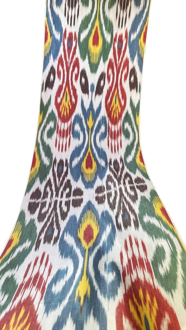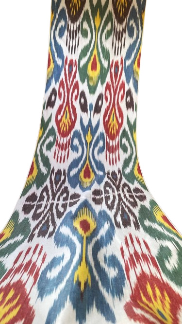 Alcuni tessuti si vedono; altri si sentono con ogni fibra del proprio essere. Questo straordinario tessuto dall’Uzbekistan è un capolavoro di gioia sfrenata ed esuberanza artistica: un Fiesta ikat veramente sensazionale che esplode di vita, energia e un irresistibile spirito di celebrazione.