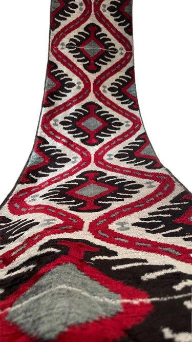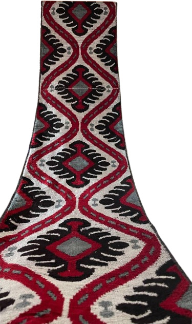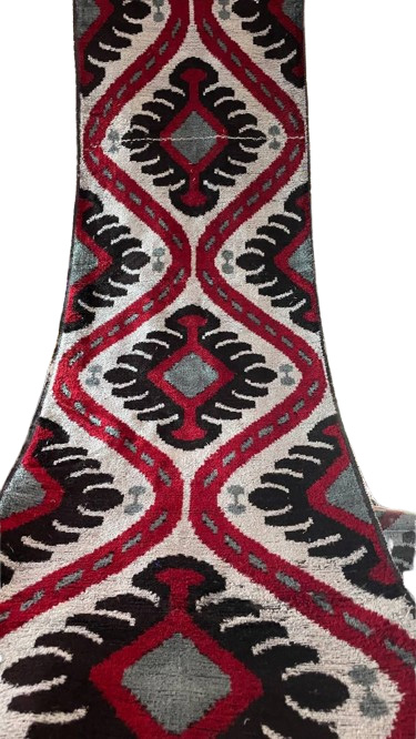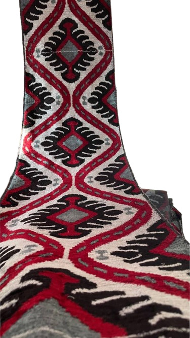Un dialogo di contrasto: L’interazione del rosso vivido, del nero profondo e del grigio freddo, evidenziata dalla nitida definizione creata dall’ikat a riserva, conferisce al tessuto una qualità quasi tridimensionale. Il modo in cui il velluto cattura e riflette la luce fa sì che il motivo appaia muoversi e risplendere, aggiungendo al suo fascino accattivante.