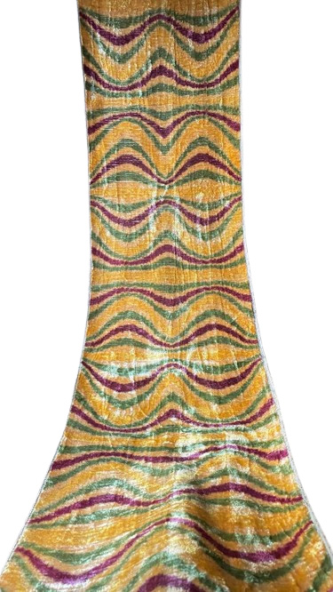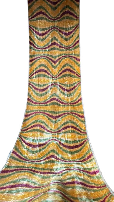 Sperimenta la rapsodia tessuta: L’autentico Velluto Ikat Senape Viola e Verde